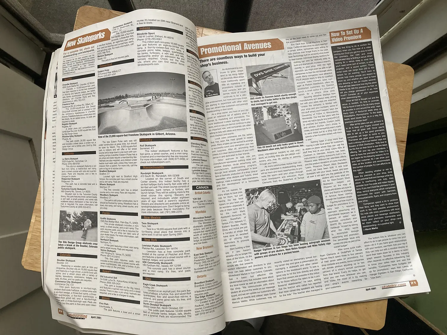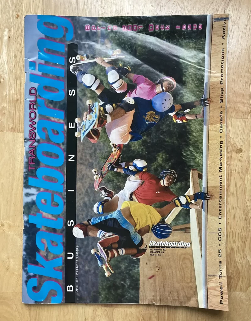 Below: Transworld Business, April 2001 edition. “Powell turns 25″ on the cover. The Magazine is a gigantic format, 10.5″ x 15”. On the right: A typical spread.